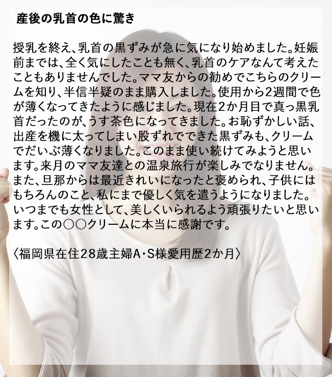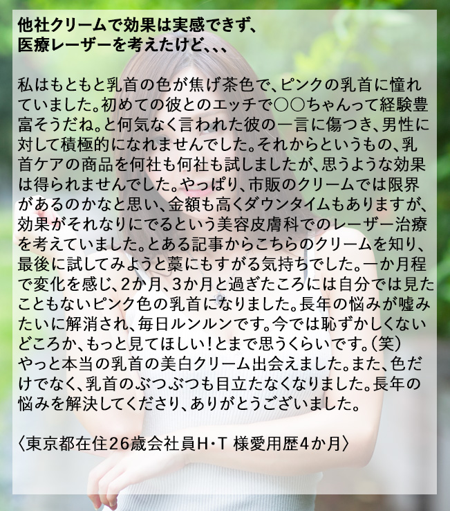 開発に至った経緯ですが、私自身とてもバスト、肌の黒ずみにコンプレックスがありました。もともと肌が弱く摩擦やカミソリなどの刺激で、すぐ肌が痒くなり掻いてしまい色素沈着を起こし、ステロイドなどで痒みを抑えていました。ご存知の方も多いと思いますが、ステロイドを使いすぎると、耐性ができ肌がくすむという副作用があります。刺激に弱い肌の柔らかい所や、vライン乳首等も色素沈着で黒ずんでいました。そんな、切実な悩みも理解できないのが男性です。当時、お付き合いしていた彼に経験豊富だね。と言われてからは、ありとあらゆる商品を試しました。海外の商品含め何本も試してみましたが、今ひとつ効果を感じることができませんでした。美容皮膚科にも行きハイドロキノンも処方していただきましたが、私には刺激が強すぎて赤くなり、我慢できないほどの痒みが出てしまったので使用を断念しました。今では、この〇〇クリームのおかげで自信を持て、毎日鏡を見るのが楽しみで仕方ありません。厳選された原料のみで植物由来にこだわり、肌の事を一番に考え科学的根拠に基づいた処方となっております。今回、日本の化粧品製作工場大手で医療機関ともお取引のある工場さまに、協力をしていただき本当に満足できる商品製作ができたと思っております。この商品であなた様が、さらに輝くためにお役に立てることを開発チーム一同、心より願っております。