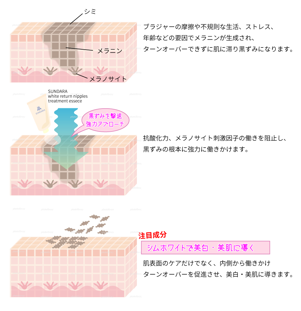 そもそもなぜ、乳首、Vラインは黒ずむのでしょうか。メラニンはもともと紫外、摩擦、間違ったケアなどの刺激から肌を守るために生産される物質ですが、過剰なメラニンは色素沈着からのシミを作る原因になります。肌のターンオーバーが正常に行われていれば、メラニンは常に代謝され、黒ずみがとどまる可能性は低くなりますが、ターンオーバーでも剥がれずとどまってしまうと色素沈着として結果黒ずみとなるのです。そして恐ろしいことに、年々濃くなっていきます。安心してください。ご自宅で簡単にケアが可能です。 自然由来のシムホワイトを配合した、国内で唯一のバストトップ、黒ずみケアの○○ならいつでもどこでも手軽に美白をめざせます。