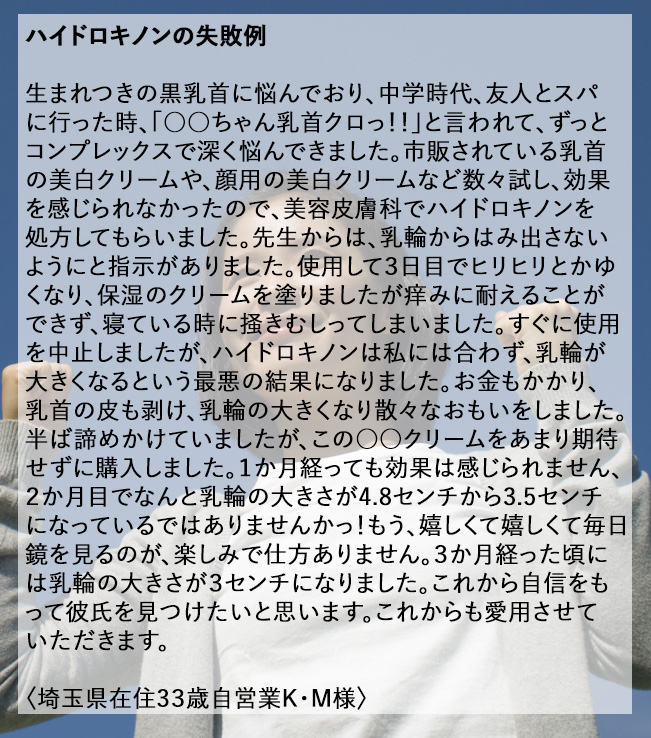 開発に至った経緯ですが、私自身とてもバスト、肌の黒ずみにコンプレックスがありました。もともと肌が弱く摩擦やカミソリなどの刺激で、すぐ肌が痒くなり掻いてしまい色素沈着を起こし、ステロイドなどで痒みを抑えていました。ご存知の方も多いと思いますが、ステロイドを使いすぎると、耐性ができ肌がくすむという副作用があります。刺激に弱い肌の柔らかい所や、vライン乳首等も色素沈着で黒ずんでいました。そんな、切実な悩みも理解できないのが男性です。当時、お付き合いしていた彼に経験豊富だね。と言われてからは、ありとあらゆる商品を試しました。海外の商品含め何本も試してみましたが、今ひとつ効果を感じることができませんでした。美容皮膚科にも行きハイドロキノンも処方していただきましたが、私には刺激が強すぎて赤くなり、我慢できないほどの痒みが出てしまったので使用を断念しました。今では、この〇〇クリームのおかげで自信を持て、毎日鏡を見るのが楽しみで仕方ありません。厳選された原料のみで植物由来にこだわり、肌の事を一番に考え科学的根拠に基づいた処方となっております。今回、日本の化粧品製作工場大手で医療機関ともお取引のある工場さまに、協力をしていただき本当に満足できる商品製作ができたと思っております。この商品であなた様が、さらに輝くためにお役に立てることを開発チーム一同、心より願っております。